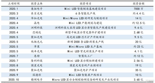 2020 年 以来Mini/Micro LED 相关投资项目