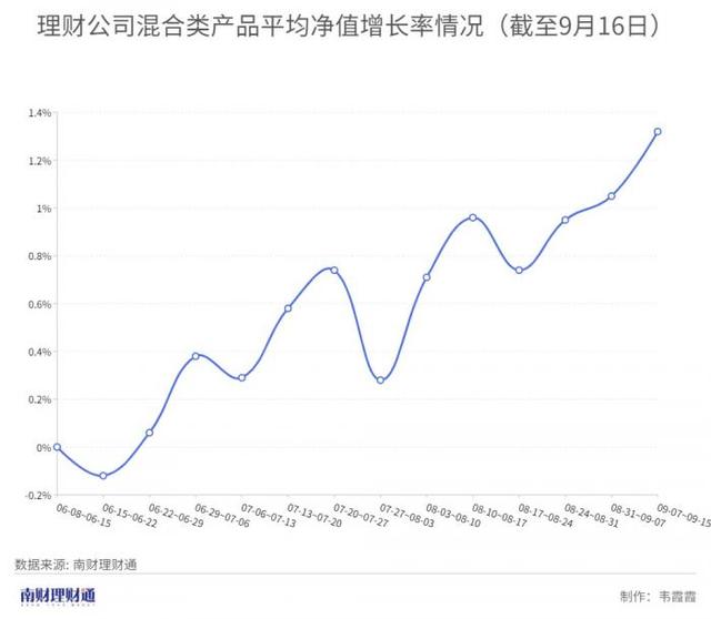 据南财理财通数据显示,从理财子公司发行的混合类产品总体走势来看,近3月行业总体平均净值增长率呈平稳走高趋势。截至9月7日-9月15日该周,理财公司混合类产品近3个月平均净值增长率较基期上涨1.32%。