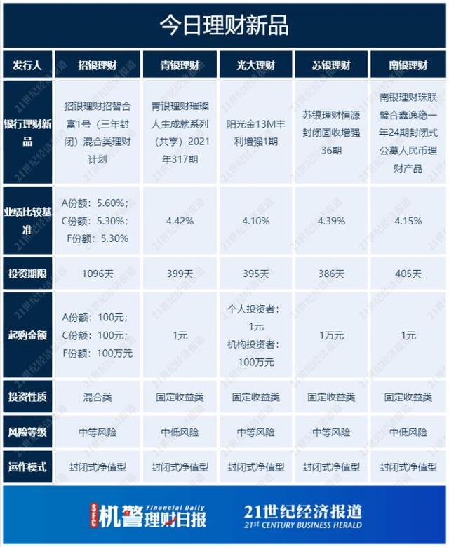 《机警理财日报》是南财理财通、21世纪经济报道旗下投资理财专栏,旨在帮投资者守好“钱袋子”。课题报道组长期关注银行理财,并搭建独有理财数据库,欢迎申请试用。本专栏每日内容各有侧重,周一聚焦固收+产品、周二纯固收产品、周三现金管理类产品、周四混合类产品、周五权益类产品,每周一至周五更新,移动端内容尽在21财经APP,平面内容尽在《21世纪经济报道》报纸【南财理财通】专栏,敬请关注!