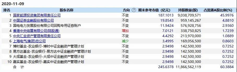 从股东持股情况来看,国电电力的股东榜单非常“豪华”,国家能源投资集团有限公司为持股46%的控股股东,证金、汇金分别持股4.88%和1.09%。此外,国电电力第六至第十大流通股东均为知名机构的资产管理计划。