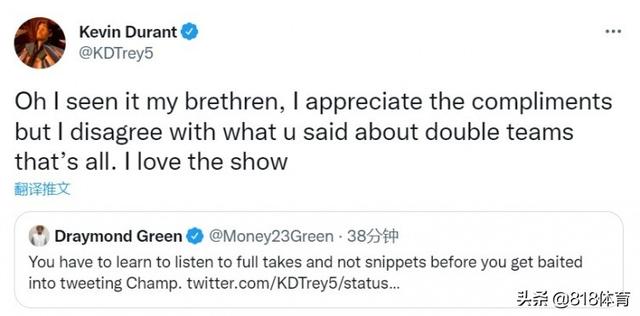 杜兰特回复说:我看了兄弟,我感谢你对我的赞美,但我不同意你们所说的包夹的部分,仅此而已。我喜欢这个节目。