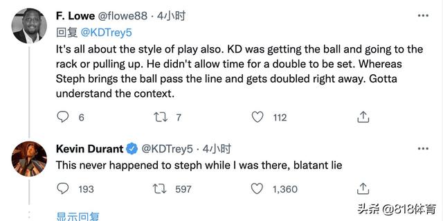 杜兰特接着回复:当我在勇士的时候这情况从未发生过,彻彻底底的谎言。