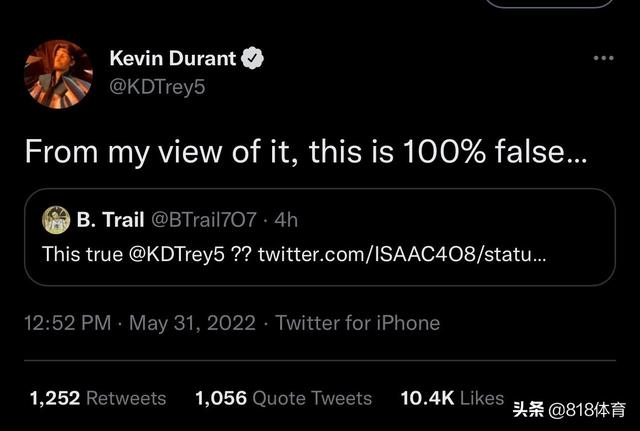 有网友带着这番言论@杜兰特,杜兰特回复:从我的视角来看,这100%是假的。