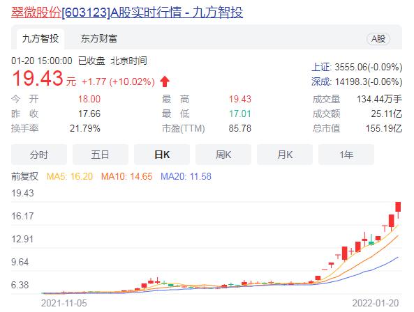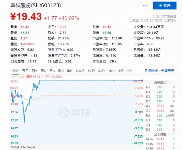 或受上述一系列利好消息影响,翠微股份股价节节攀升,从1月4日就开始拉涨停大涨,至今已经走出14天9涨停的行情,近20个交易日累计涨幅已超150%,今日股价更是创历史新高!
