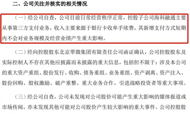 1月19日翠微股份涨停时,翠微股份就发布股价异动公告,控股子公司海科融通主要从事第三方支付业务,收入主要来源于线下银行卡收单手续费,新增数字人民币支付方式不改变其收入来源与结构,其所产生的收入将取决于未来线下商户和消费者的实际使用情况,不会对其收单业务规模和经营业绩产生重大影响。