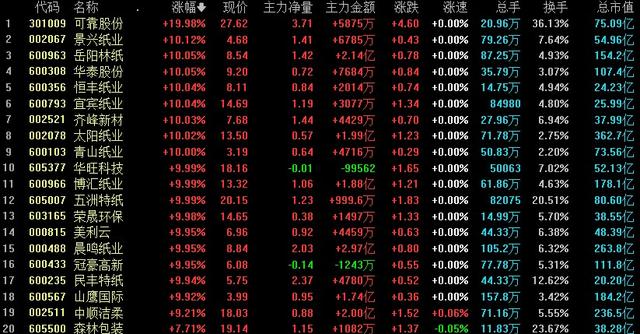 9月23日盘中,造纸板块早盘冲高,截至收盘板块涨幅超过9%,板块中可靠股份(301009)20CM涨停,景兴纸业(002067)、岳阳林业、华泰股份(600308)、恒丰纸业(600356)、宜宾纸业(600793)等多股涨停。