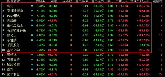 今日全天化工板块集体熄火,截至收盘磷化工、有机硅概念、PVDF概念、丙烯酸、氟化工概念、石油矿业开采、煤化工等霸占跌幅榜。