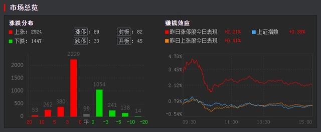 3、两市共2924只个股上涨,1447只个股下跌;涨停89家,跌停33家。
