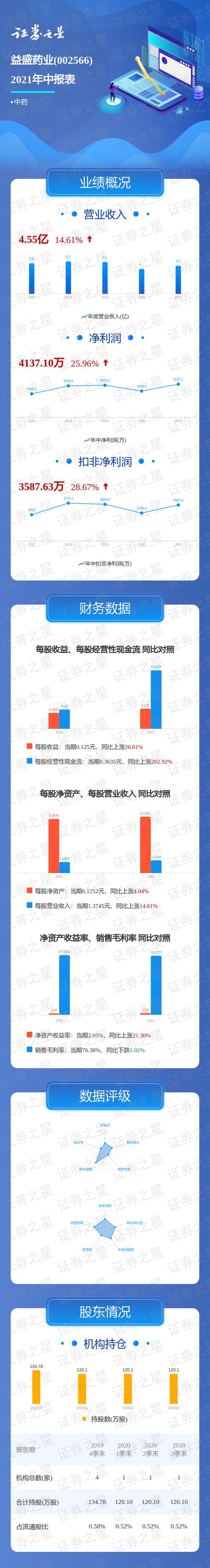 本文摘要:证券之星数据中心讯,益盛药业2021中报显示,公司主营收入4.55亿元,同比上升14.61%;归母净利润4137.1万元,同比上升25.96%;扣非净利润3587.63万元,同比上升28.67%;负债率20.35%,财务费用203.49万元… …