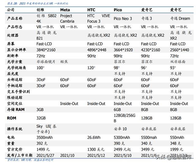 2021 年,国内主流品牌发布的 VR 中,公司推出的 S802 4K 一体机分辨率、光学视场角等指标具备一定优势,另外价格 1499 元,较 pico、爱奇艺三千元以上、两千元左右的定价而言,性价比优势突出。