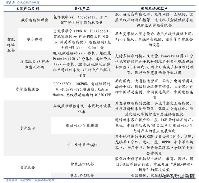 公司具体业务涵盖智能终端(智能机顶盒、融合终端、VR 等)、宽带连接(PON、Wi-Fi 路由器、Cable Modem、CPE)、专业显示(中小尺寸显示模组、LED 显示器件、车载显示触控系统、车载数字液晶仪表等)及运营服务(智慧城市、B2B 售后增值服务等)。