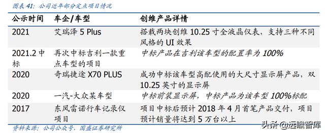 2)数字液晶仪表产品,2021 年扩展了客户过往量产相关车型的延伸项目,同时也再次中标客户重量级车型新项目,并通过与新定点客户合作启动了全新高清液晶仪表平台的迭代开发。