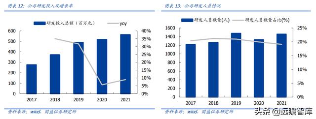 2020~2021 年公司研发支出分别为 5.17 亿元、5.63 亿元;研发强度分别为 6.08%、5.19%。2021 年公司拥有研发人员 1457 人,占公司人员总数的 19.09%;公司研发团队常年维持在千人以上,规模较大。(报告来源:远瞻智库)
