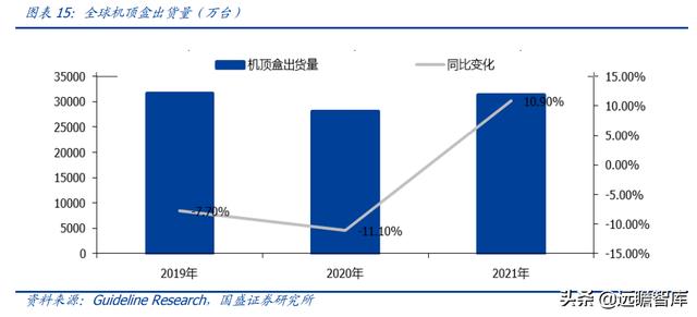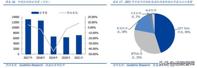 1)机顶盒:全球光纤化、IP 化及 OTT 背景下,云游戏、物联网,数字化、高清化及智能应用,盒子作为运营商服务用户的载体,不断迭代、升级与替换,2021 年全球机顶盒增速显著回暖,预计后续几年出货规模较平稳,4K 机顶盒不断放量,未来 8K 机顶盒新品更迭。