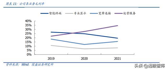 展望 2022 及以后,4K 机顶盒不断放量,未来 8K 机顶盒新品更迭,VR 销售规模增加等,有望提振智能终端毛利率。2021 宽带连接毛利率 16%,同比提升 4pt;专业显示毛利率 8%,同比提升 1pt;运营服务毛利率 35%,同比提升 8pt。