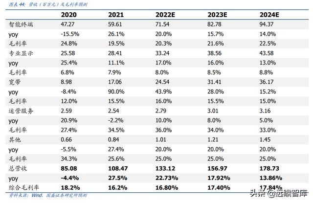 分业务看,智能终端业务毛 利率有所下降,2021 同比减少约 6pt 至 19%,我们认为随公司在海外业务拓展(2K,4K 产品占比变化,开拓新客户)、疫情及原材料短期波动等影响,毛利率有所下降属合理现象。