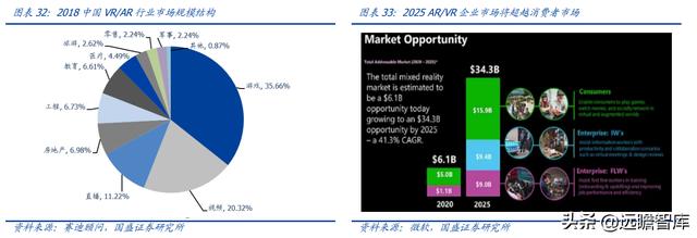 当前 AR/VR 市场中,VR 消费者市场规模 50 亿美元,占比 81.97%;其中 VR 硬件设备,VR 游戏市场是重要构成。据微软预测,至 2025 年,企业市场规模(184 亿美元,占比 43.64%)将超过消费市场(159 亿美元)。