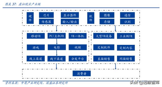 VR/AR 产业链主要分为硬件和软件两部分,其中硬件主要包括芯片、传感器、显示器件 等,软件分为基础软件和应用软件。