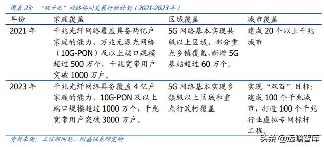 2021 年以来,国家相关部委相继出台了《“双千兆”网络协同发展行动计划(2021-2023 年)》、《5G 应用“扬帆”行动计划(2021-2023 年)》及《“十四五”信息通信行业发展规划》等文件,加快推进千兆光网和 5G 网络部署,要求加快“千兆城市”建设,持续扩大千兆光网的覆盖范围