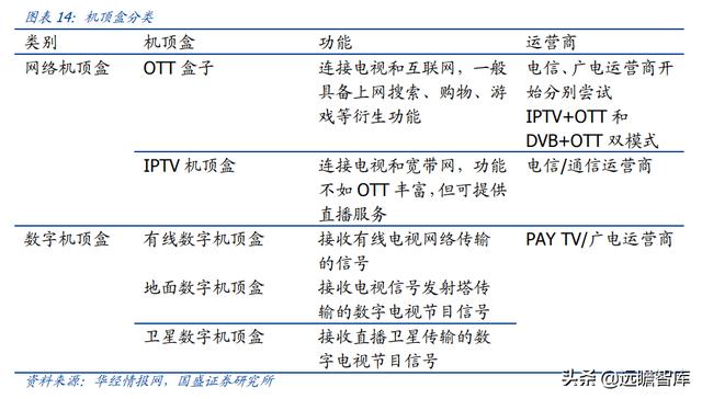机顶盒厂商上游主要系芯片/软件厂商,下游依据接受信号类型不同,面向不同类别运营商或 2C 用户。其中,IPTV+OTT 机顶盒下游主要系电信、通信综合运营商,数字有线机顶盒下游主要系 PAY TV 及广电运营商,OTT2C 盒子下游主要系 2C 零售终端用户。