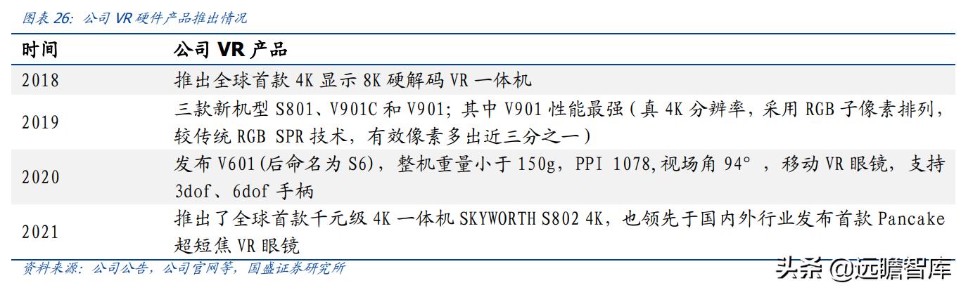 公司 VR 硬件软件皆有布局,体现较强一体化优势。公司当前 VR 产品具体包括 8K 视频硬解码 VR 一体机、超短焦 Pancake 轻薄 VR 分体机、高性价比 4KVR 一体机、XR 高清视频及分体机互通软件系统、VR 行业应用解决方案。