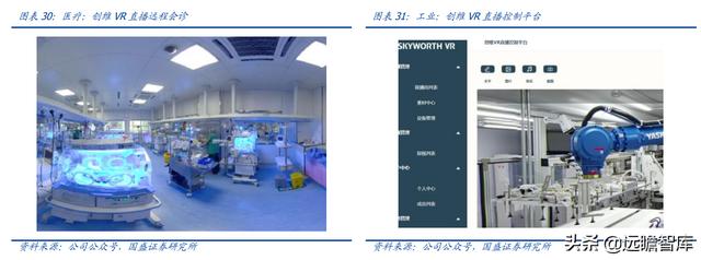 工控应用:VR 技术可实现对工厂的 360°全景巡检,为工厂建设提供高效、安全的监管手段,减少现场工作人员的负荷,降低巡检难度,提高安全精度。创维 VR 研发并多次成功落地一套专业智慧工厂直播解决的方案,在工厂车间或者制造基地进行多点位安装全景相机进行视频采集,并实时拼接,再通过 5G 网络将直播图像上到云端,控制平台将直播画面推送到观看设备上,同时能控制视频源切换,可以进行添加文字、动画特效。