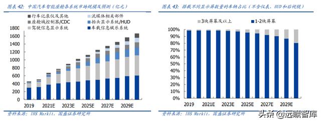 据 IHS 数据,单车配置 3 块显示屏及以上的车辆占比将由 2022 年的 1%增至 2025 年的 4%,2030 年的 19%;
