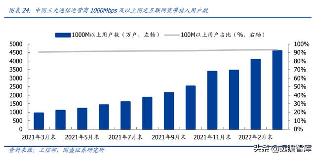 据工信部,2021 年 12 月我国千兆带宽用户份额已达 6.5%。截至 3 月末,三家基础电信企业固定互联网宽带接入用户总数达 5.51 亿户,较上年末净增 1513 万户。其中,1000Mbps 及以上接入速率的固定互联网宽带接入用户达 4596 万户,比上年末净增 1140 万户;1000Mbps 及以上用户数占比约 8.3%,较去年底 6.5%渗透水平提升约 1.8pt。