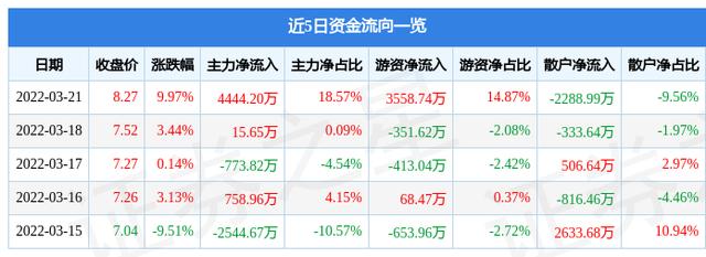 资金流向数据方面,当日主力资金净流入4444.2万元,游资资金净流入3558.74万元,散户资金净流出2288.99万元。近5日资金流向一览见下表: