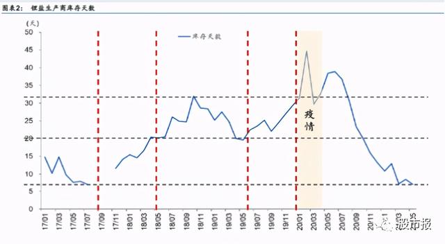 由于新能源汽车行业景气度高涨,直接促进了上游原材料产业的供需两旺,锂盐生产商处于被动去库存阶段,根据各大厂商的库存情况来看,截至21年5月中国锂盐生产商库存天数约7天,接近2017年至今最低点。