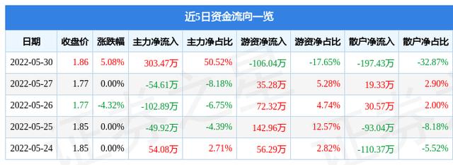 资金流向数据方面,5月30日主力资金净流入303.47万元,游资资金净流出106.04万元,散户资金净流出197.43万元。