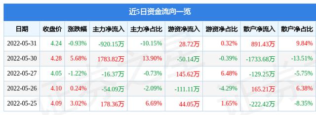 资金流向数据方面,5月31日主力资金净流出920.15万元,游资资金净流入28.72万元,散户资金净流入891.43万元。