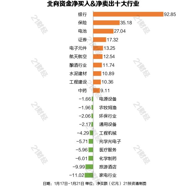 从净买入金额来看,北向资金增持了67个行业,其中银行居首,净买入金额达92.85亿元,其中超五成买入招商银行(600036.SH)。从净卖出金额来看,本周北向资金减持了33个行业,其中家电行业最多,净卖出金额达11.02亿元,其次是旅游酒店行业,净卖出9.99亿元。