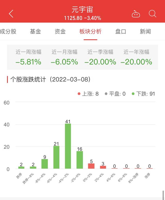中国经济网北京3月8日讯 今日,元宇宙板块整体涨幅-3.40%,其中8只股票上涨,91只股票下跌。