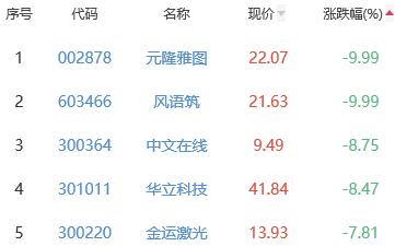 元隆雅图、风语筑 、中文在线、华立科技、金运激光位列板块涨幅后五位,涨幅分别为-9.99%、-9.99%、-8.75%、-8.47%、-7.81%。