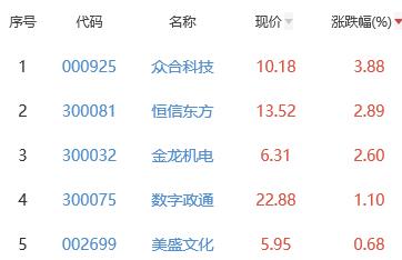 其中,众合科技、恒信东方、金龙机电、数字政通、美盛文化位列板块涨幅前五位,涨幅分别为3.88%、2.89%、2.60%、1.10%、0.68%。