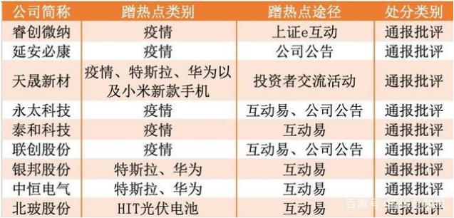 除东方生物外,当时深交所、上交所还给予了睿创微纳、天晟新材、永太科技、泰和科技、联创股份、银邦股份、中恒电气、北玻股份等其他9家企业通报批评,均与当时的信息披露有关,有的是谈疫情,有的是谈与特斯拉、华为的合作有关。