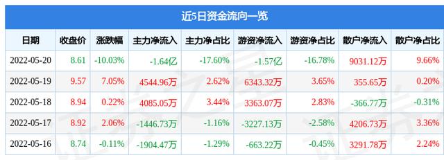 资金流向数据方面,5月20日主力资金净流出1.64亿元,游资资金净流出1.57亿元,散户资金净流入9031.12万元。
