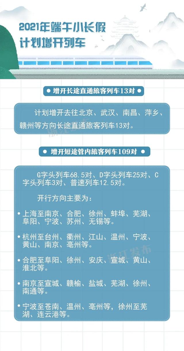2021年长三角铁路端午小长假旅客运输方案于近日出台,计划增开122对旅客列车,满足旅客出行需要。快跟着小余儿一起来看看吧!