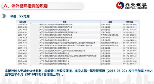 巧合的是,在王姓研究员示例的“造假素材”中,截取“XX电商”的实控人股权质押公告的最后时间,是2019年3月19日。这说明,这份报告可能写于2019年3月中下旬。
