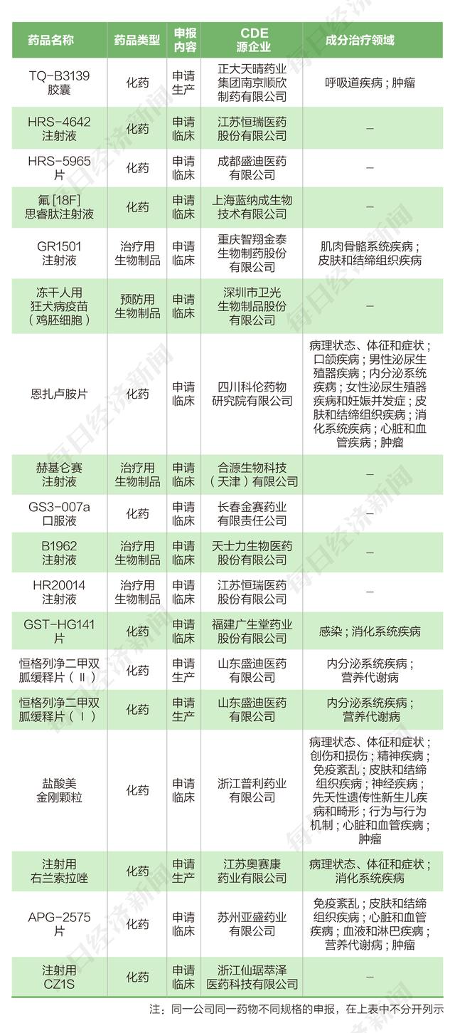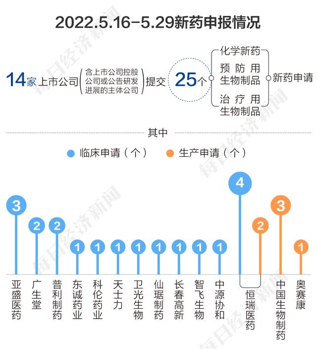 2022年5月16日至5月29日期间,上市公司方面,恒瑞医药(600276.SH)申报2个生产申请和4个临床申请,中国生物制药(01177.HK)申报3个生产申请,奥赛康(002755.SZ)申报1个生产申请;亚盛医药(06855.HK)申报3个临床申请,广生堂(300436.SZ)和普利制药(300630.SZ)分别申报2个临床申请,东诚药业(002675.SZ)、科伦药业(002422.SZ)、天士力(600535.SH)、卫光生物(002880.SZ)、仙琚制药(002332.SZ)、长春高新(000661.SZ)、智飞生物(300122.SZ)、中源协和(600645.SH)分别申报1个临床申请。