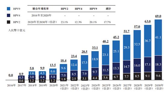 中国HPV疫苗市場产值,2016年至2030年(估计) 图片来源:瑞科生物招股说明书