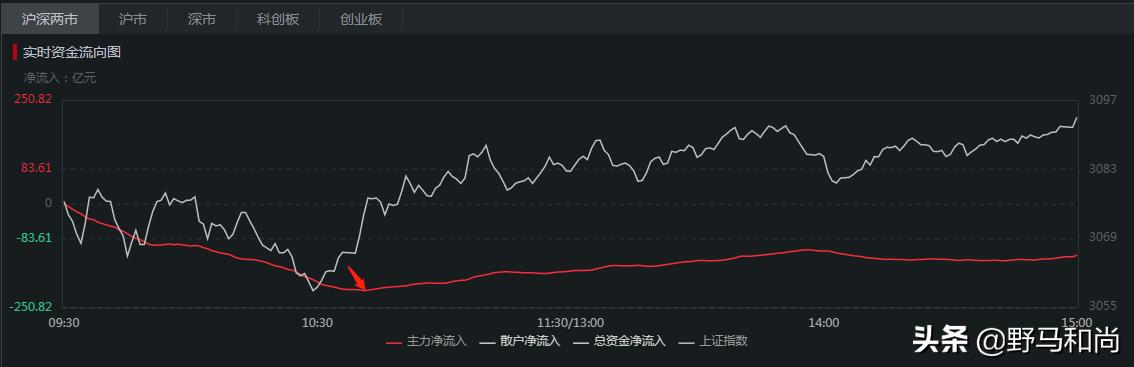 从市场主力机构资金流向来观察,在分时交易图上,早上一开盘,主力就坚定流出超200亿元,之后在大盘回暖的过程中,机构资金有小量回补,可以看出是被动性回补,因为在大盘震荡回升的过程中,机构资金实际上是躺平的(红线)。全天交易下来,机构继昨天出逃325亿元后,今天又出逃了123.5亿元。