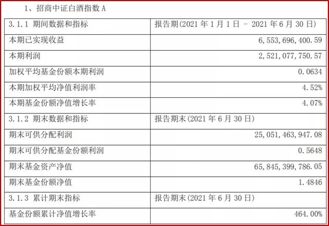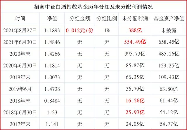 公告虽然没有披露招商中证白酒指数基金目前的总份额,但以2021年6月末的总份额470亿计算,招商中证白酒指数基金此次分红金额大约为470×0.12/10=5.64亿,分红占未分配净利润的比例高达5.64/388=1.45%;如果按基金累计净值计算,分红比例为0.12/2.84=4.22%。