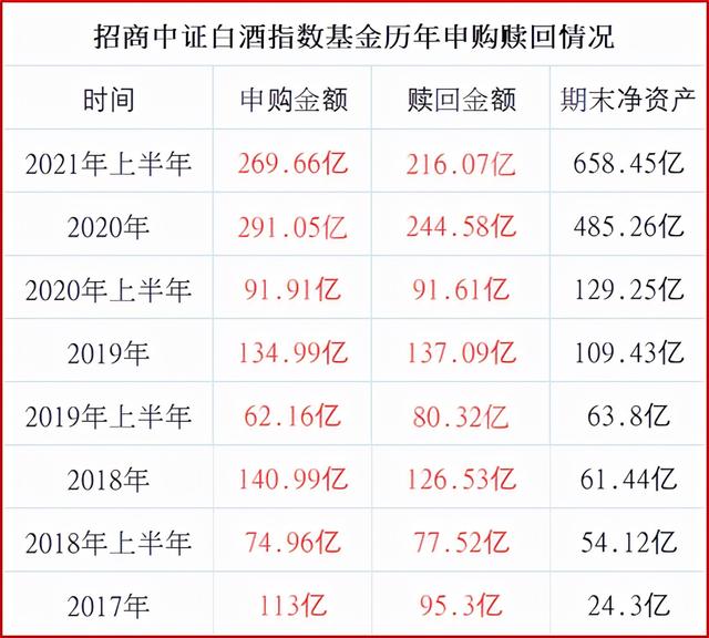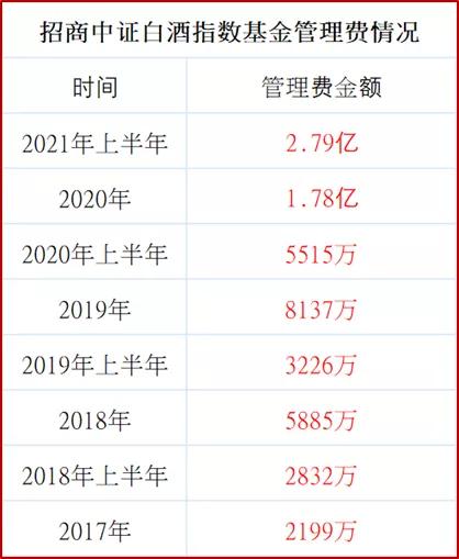 对于基金公司来说,收入来源主要是管理费。以招商中证白酒指数基金为例,其每年收取1%的管理费。以2021年6月末的规模计算,其一年的管理费收入高达6.58亿元。