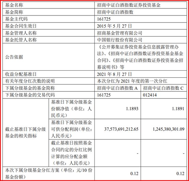 公告显示,截止到2021年8月27日,招商中证白酒指数下属的两个分级基金A和分级基金C的净值分别为1.1893元和1.1891元,可供分配净利润分别为375.74亿元和12.45亿元,合计可供分配净利润超过388亿元!