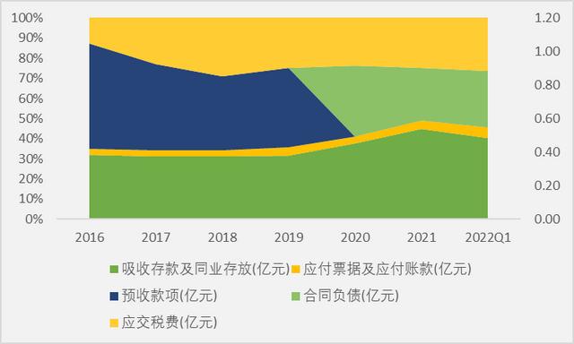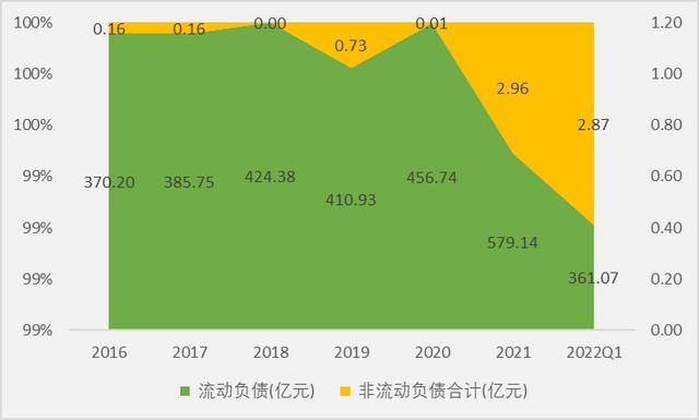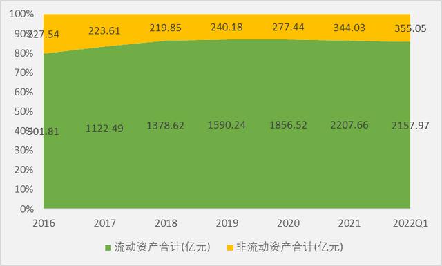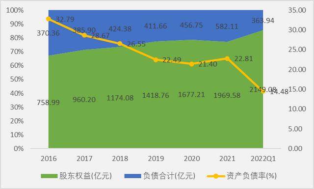 截止2021年Q1,公司总资产2513.02亿元,股东权益2149.08亿元,负债总额363.94亿元,资产负债率14.98%;负债方面,流动负债361.07亿元,占比99.21%,非流动负债2.87亿元,占比0.79%;资产方面,流动资产2157.97亿元,占比85.87%,非流动资产355.05亿元,占比14.13%。