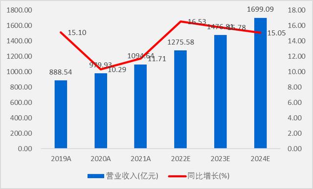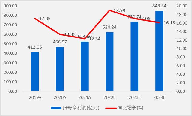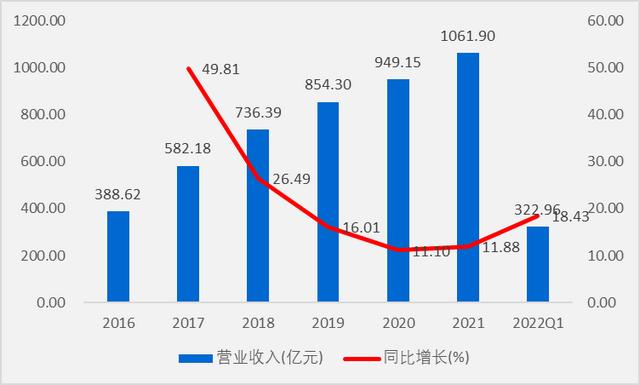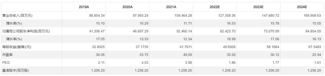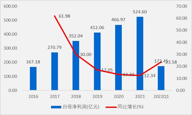 2021年公司实现营收同比增长11%至1061.90亿元,5年复合增长率22.27%;归母净利润同比增长12.34%至524.60%,5年复合增长率25.70%;扣非归母净利润同比增长11.84%至525.84亿元,5年复合增长率25.40%;经营活动现金流同比增长23.92%至640.29亿元,5年复合增长率11.32%。