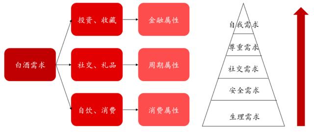 从需求角度出发,白酒分为自饮&消费、社交&礼品、投资&收藏三个层次需求,经济发展与个人收入提升带动高层次需求提升。结合马斯洛需求层次理论可以将白酒需求划分为自饮&消费、社交&礼品、投资&收藏三个层次的需求,其中 1)自饮&消费具有消费属性,主要对应马斯洛需求层次的生理需求和安全需求;2)由于经济发展较快,企业和个人收入上升时社交和商务宴请会更加频繁,因此白酒的社交&礼品方面具有较强的周期属性,主要对应社交需求和尊重需求;3)投资&收藏具有则具有较强的尊重需求与自我需求,具有明显的金融投资属性。根据马斯洛需求层次理论,消费需求基于满足与被满足的状态下相互转化与升级,即在一个层级的需求被满足之后,会向更高的层级递进发展,包含的内容也更加丰富,其需求更加多元,蕴含的意义更加深刻。因此随着经济发展与个人收入的提升,白酒的需求逐渐向更高层次的需求转移。