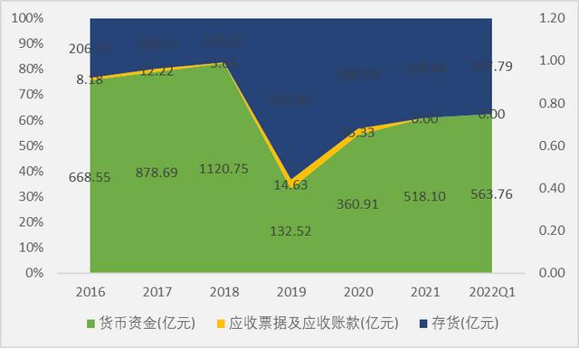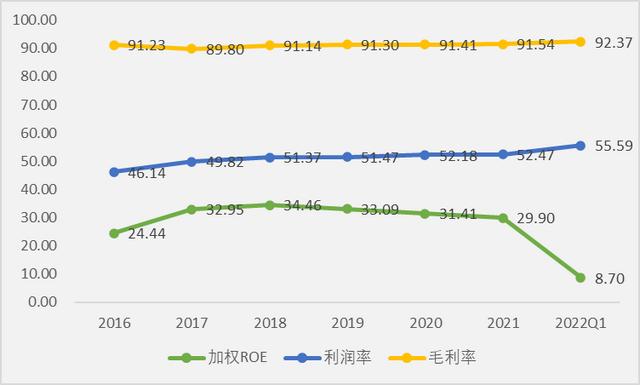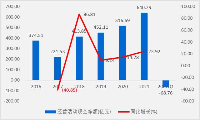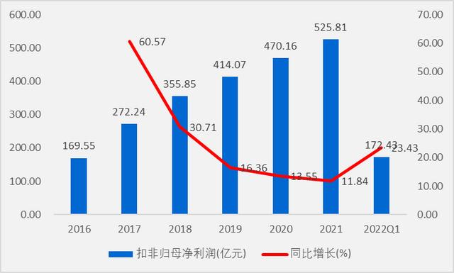2022Q1实现营收同比增长18.43%至322.96亿元;归母净利润同比增长23.58%至172.45亿元;扣非归母净利润同比增长23.43%至172.43亿元;经营活动现金流-68.76亿元。